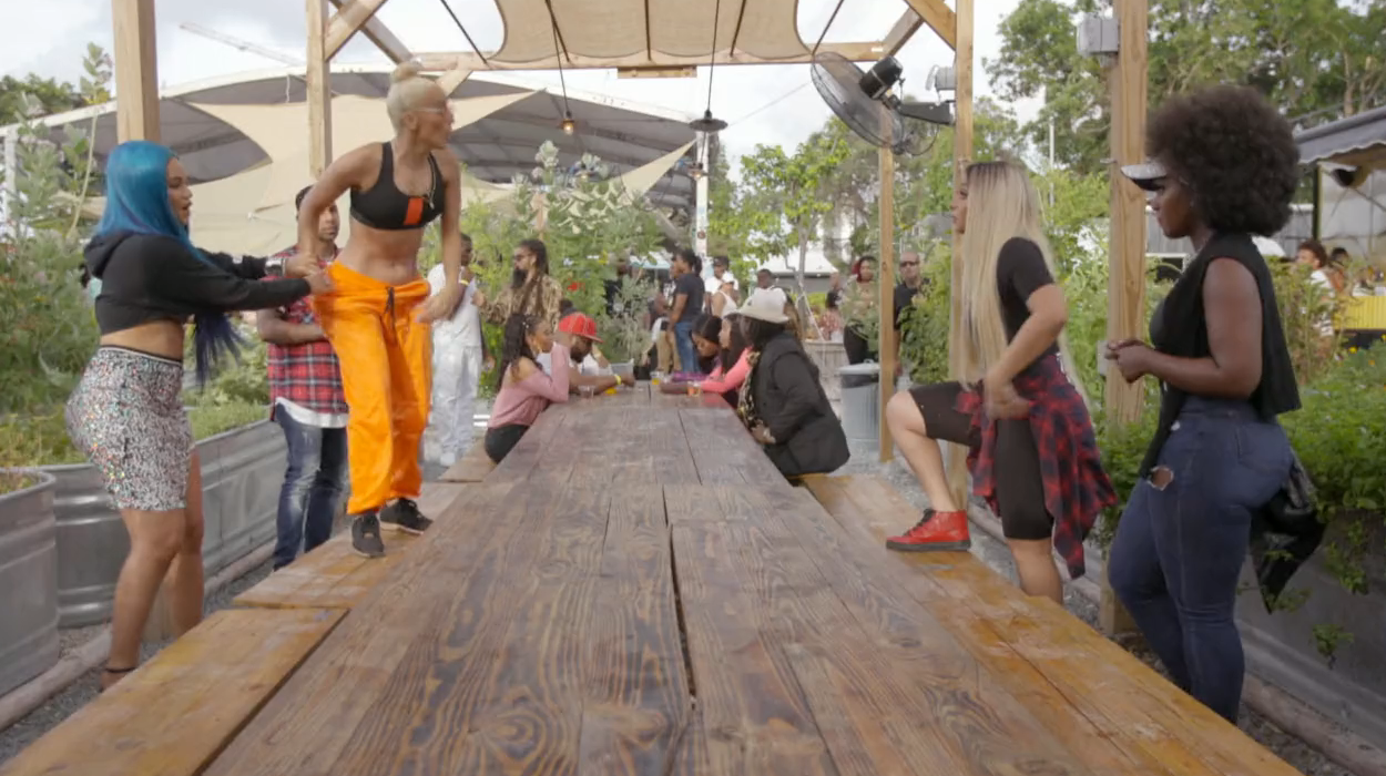 Veronica hops on the table Mariahlynn-style and Amara quickly comes to Jojo's defense. Even more amped up now that things have escalated, Veronica yells to Amara, "You're a fake ass hoe, with fake ass hair, representing a culture that you don't even f--ing understand." Skin tones become the center of the argument again and while Veronica says they're "all black" and "all come from the same place." She says there is a difference in real and fake and that's her problem. The name-calling and yelling continues and well, sis with the drink is me when something pops off while I was minding my business but still nosy as hell.