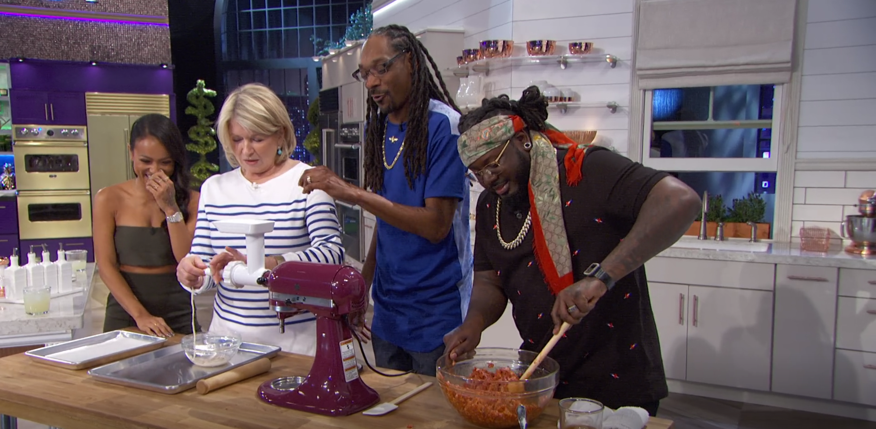 Martha asks T-Pain to stuff the meat into the sausage maker, and immediately Snoop is like: